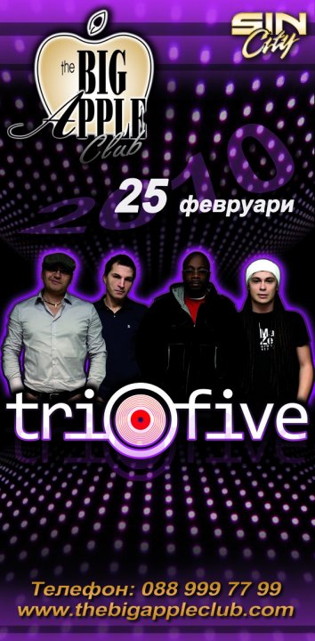 Петък, 5-ти /пети/ февруари. Това е датата на предстоящия концерт на група Tri O Five в Sofia Live Club под мотото GOOD MUSIC|GOOD PEOPLE|GOOD VIBES.