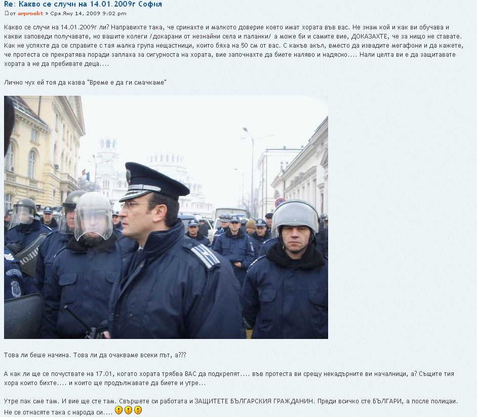 Абсълютно съм съгласен с мнението на AntWarrior. Жалко, че журналистите се оказаха потърпевши. От записите на Канал 3 стана ясно, че именно групата на вандалите са им се отворили още в началото. Никой обаче не дойде да каже при организаторите, че има агресивно настроени хора към журналистите. При нас такива хора няма и можеше да се реагира много по-бързо и от наша страна, преди вандалите да получат необходимия щит в лицето на хилядната тълпа. А са се отваряли на фоторепортерите, защото не са искали да бъдат снимани. Но в момента, в който камерите се озоваха на загражденията, беше пределно ясно, че от тях ще има пострадали най-малкото заради мятането на ледени парчета и железа, доста от които отиваха не където трябва. А в един момент лумпените тръгнаха срещу камерите с палките, които бяха успели да изтръгнат от полицията. А щитовете изобщо не се намесиха... След това има няколко случая на малтретирани журналисти от полицаите, тъй като е заснето как трепят случайни хора по улиците, докато гонят митингуващите. Не мога да коментирам дали тримата от пейката бяха случайни или не, тъй като не знам кой ще седи навън на пейка в такова време. Но това, че им разбиха главите и оцветиха снега, изобщо не беше оправдано. Можеха просто да ги обездвижат, без да използват оръжие. Съгласен съм, че някой път и на полицаите им идва много. Говорихме след протеста с охраната на общината, която беше от полицаи, надълго и нашироко по тези теми. Представям си и на мачовете какво им е.