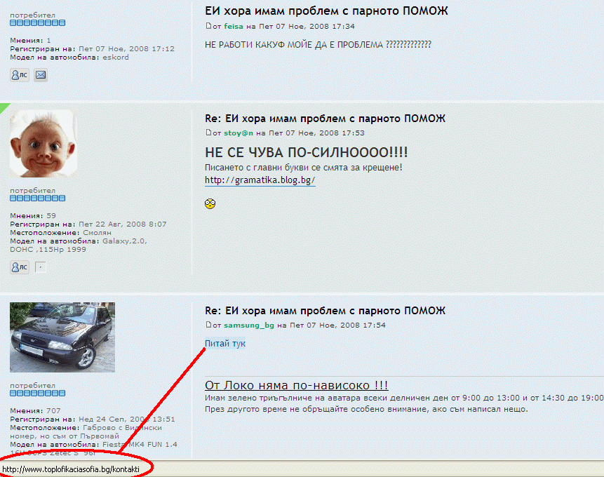 Понеже тука се пускат всякакви бисери и главно не от форума, и аз ще пусна нещо "чуждо" - по-точно от форума на Форд, разделът е "Ремонт, експлоатация, поддръжка, тунинг". Пича иска помощ за парното в колата си, но вижте как. И какво му се отговаря...