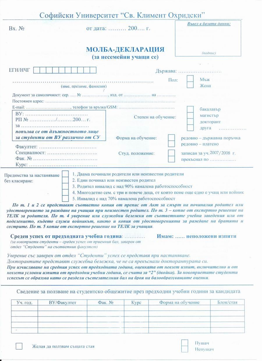 Аз прилагам копие на молбата за кандидатстване за общежитие за който се интересува.