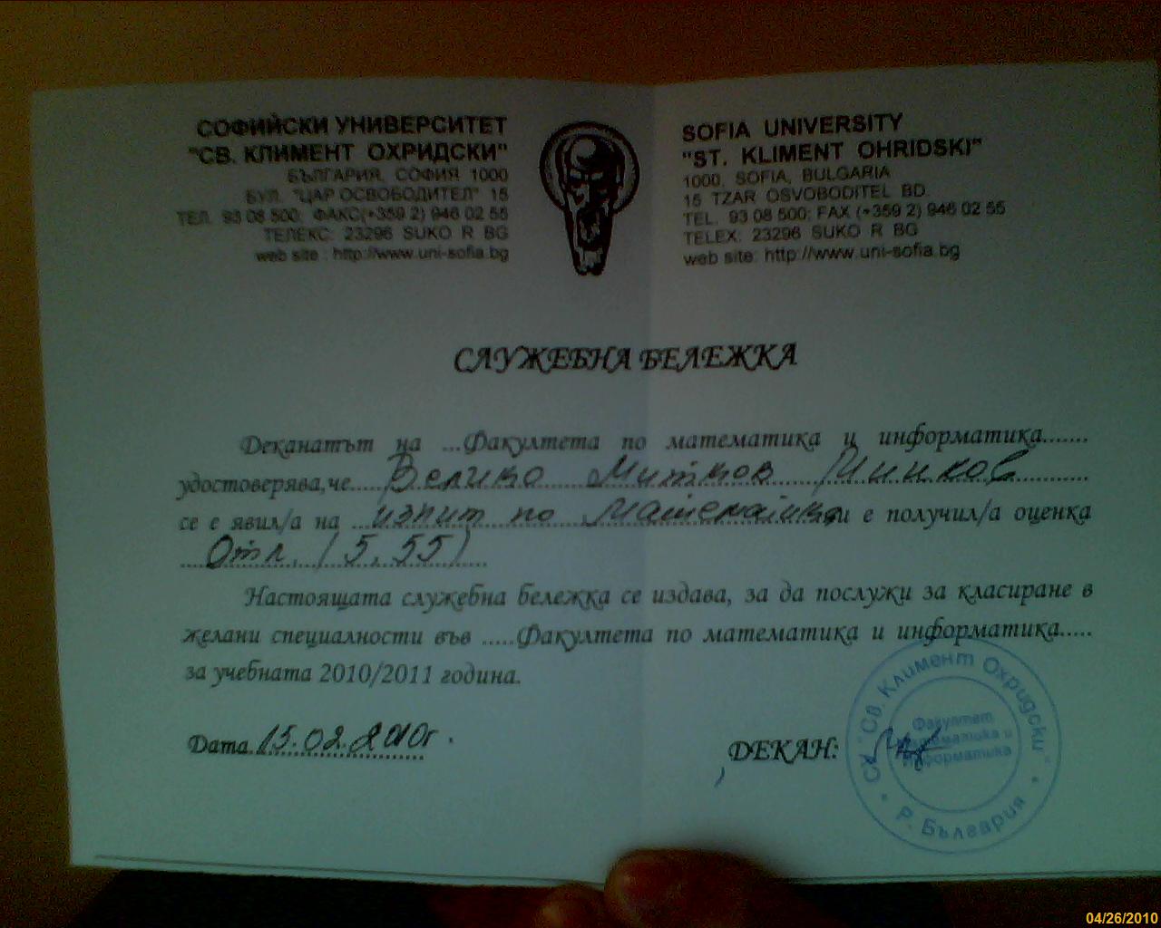 Благодаря за снимката vicho. Все още остава въпроса, дали тези бележки ще се издадат и за от личниците от 3тия изпит. Все пак изпита е на 13.07, на 25.07 се обявява първото класиране и от 26.07 до 28.07 класиралите се могат да се запишат. Vicho е получил бележката си 2 седмици след изпита, очевидно този път не разполагат с толкова време. Вариантите според мен са следните: 1. кандидат-студентите изкарали оценка поне 5.50 на 3тия изпит ще могат да участват в класирането с бал 30 дори да нямат такава бележка (все пак не е толкова трудно автоматично да се приеме за бал 30), 2. като гледам се попълват много малки полета и не би трябвало да е кой знае какъв проблем тези бележки да се получат при записването (26.07-28.07) 3. "промоцията" няма да важи за 3тия изпит. Аз нещо много се вживявам, като че ли на 100% на 3тия изпит ще изкарам над 5.50 :D не се знае все пак, всеки има този шанс..