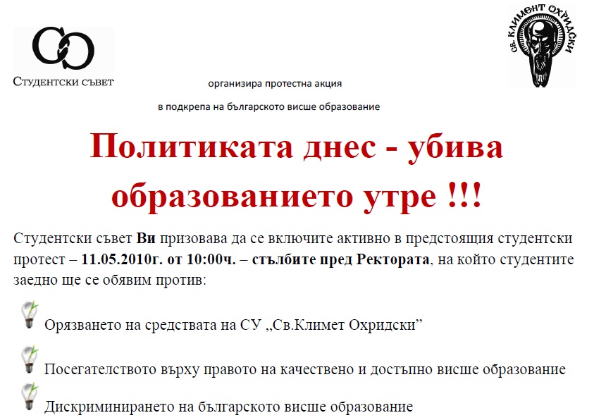 11 май 2010 г. от 10 часа на стълбите пред Ректората.Студентски съвет призовава всички студенти на Софийски университет ‘’Св. Климент Охридски’’ да се включат активно в организирания протест на 11 май 2010 г. До тази крайна мярка се стигна след като стана известен фактът, че са били орязани средствата на най-стария български университет.