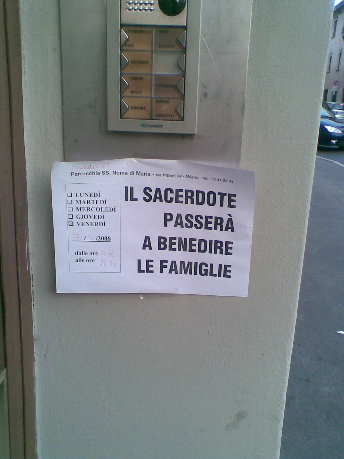Коментар на файл: За тези, които не разбират италиански, които са твърде голяма част от форума и тези, които не могат да си го преведат, защото не са учили достатъчно добре романски езици парвим симултатен превод в ефир: Надписът в дясно "Il sacerdote passera` a benedite le famiglie означава:" "Свещеникът ще мине да благослови семействата:" а в ляво е отбелязано Петък, 17 октомври от 4 и половина до 8 и половина
