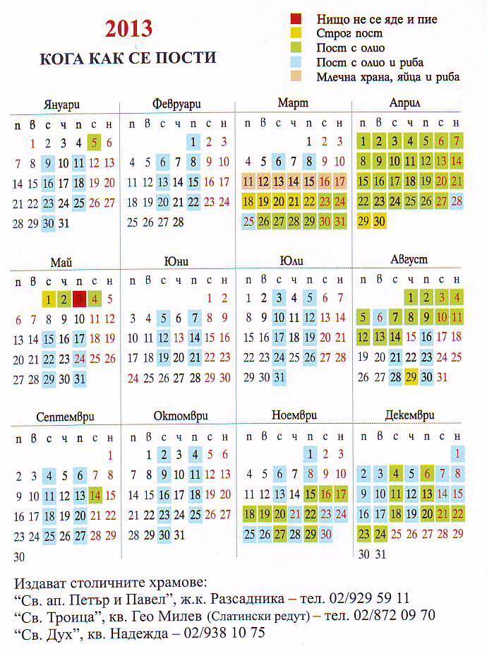 Аз спазвам целогодишния календар на постите. Ето го: