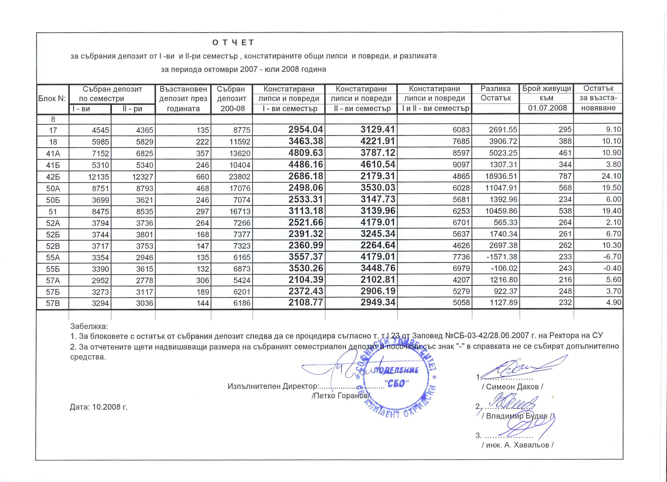 От този отчет става ясно, че така отчетените средства, в случая приходи от депозити, напълно покриват щети и др. т.н. Ясно се забелязва и др. факт - в някой от блоковете на студентите се дължи сума за въстановяване, надвишаваща депозита от 15 лв. ( 42Б ил 51 бл.).