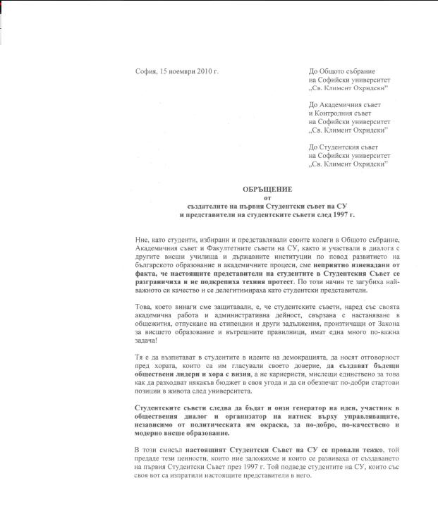 А нека приемем другия вариант. Какво ще стане ако сс не си подаде оставката. Ще ги избиете ли? Ще стигнете ли до насилие само и само за да е вашето? Не забравяйте, че колегите, които са в сс също са студенти като нас. Вие сте готови да се избивате един другиго само и само да докажете правотата си. Не трябва да се бием по между си, а срещу тези, които смазват СУ и образованието. СУ много добрe знаете кой го смазва, един син на бивш ректор на алма матер. Предполагам знаете и образованието кой смазва. Колеги, на там трябва да насочим усилията си, а не да се раздираме отвътре и да бием и псуваме и заплашваме един другиго.
